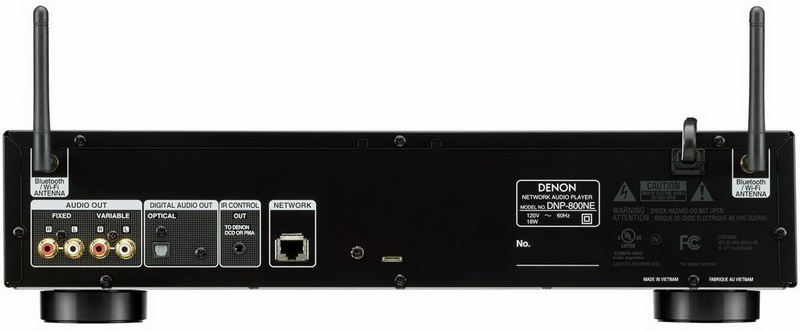 Сетевой проигрыватель Denon DNP-800NE оснащен оптическим и линейным (RCA) выходами. Есть выходной ИК-разъем, который дает возможность активировать компоненты Denon, подключенные к Denon DNP-800NE. Модель имеет две Wi-Fi-антенны для надежного беспроводного соединения.