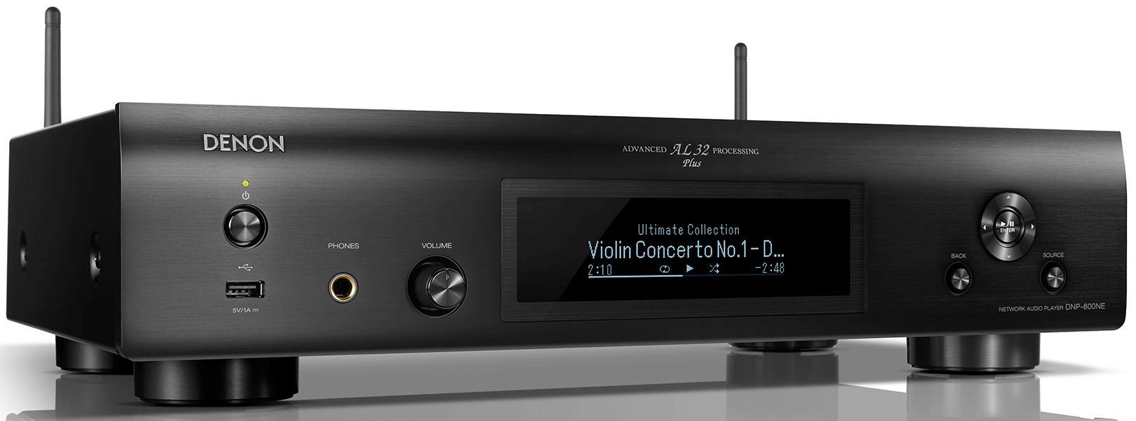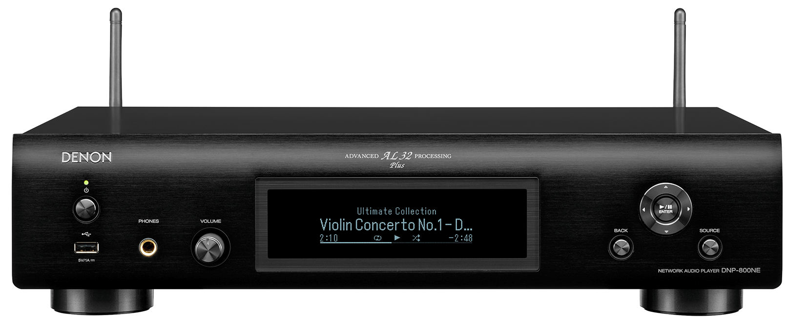 Denon DNP-800 NE, благодаря ЦАПам Burr-Brown PCM-1795, поддерживает воспроизведение файлов DSD до 5,6 МГц, сохраненных на музыкальном сервере в домашней или USB-памяти, а так же аудио файлы PCM до 192 кГц / 24 бит, WAV, FLAC и Apple Lossless. Последняя версия «Advanced AL32 Processing Plus» оригинальной аналоговой технологии воспроизведения сигналов Denon поддерживает источники звука с высоким разрешением. В случае PCM 44,1 кГц / 16 бит обработка с повышающей дискретизацией и расширением бита выполняется до 705,6 кГц / 32 бит.