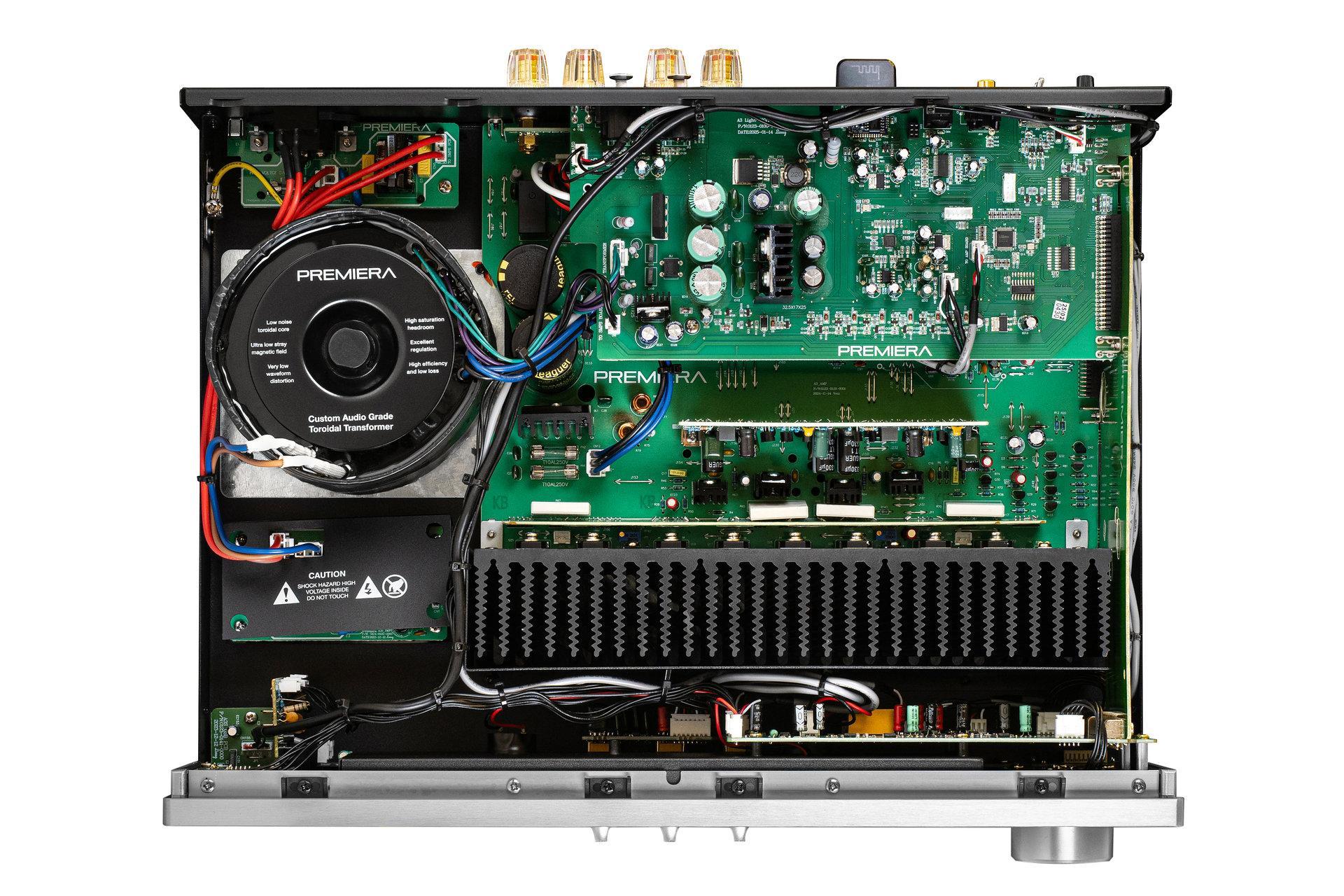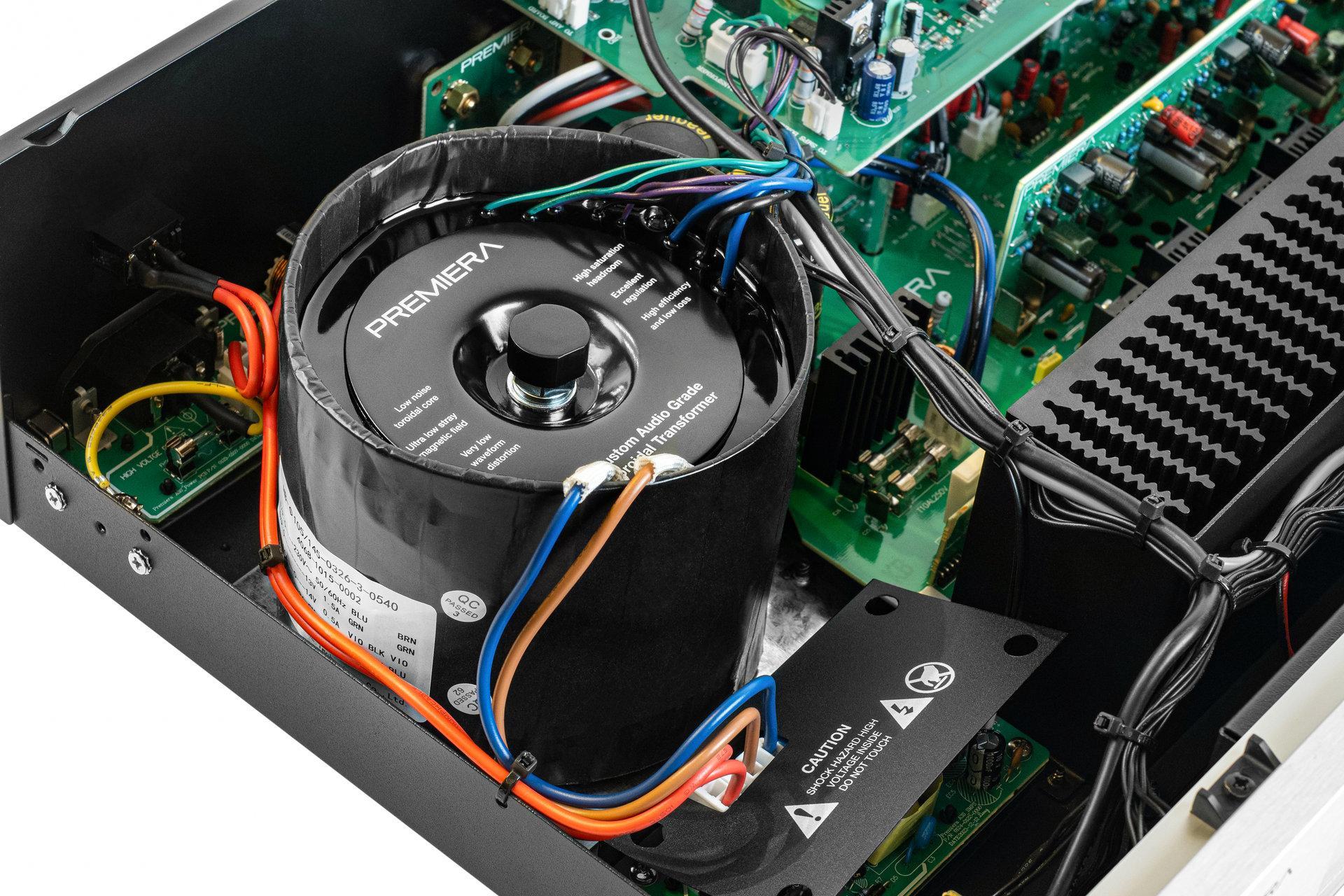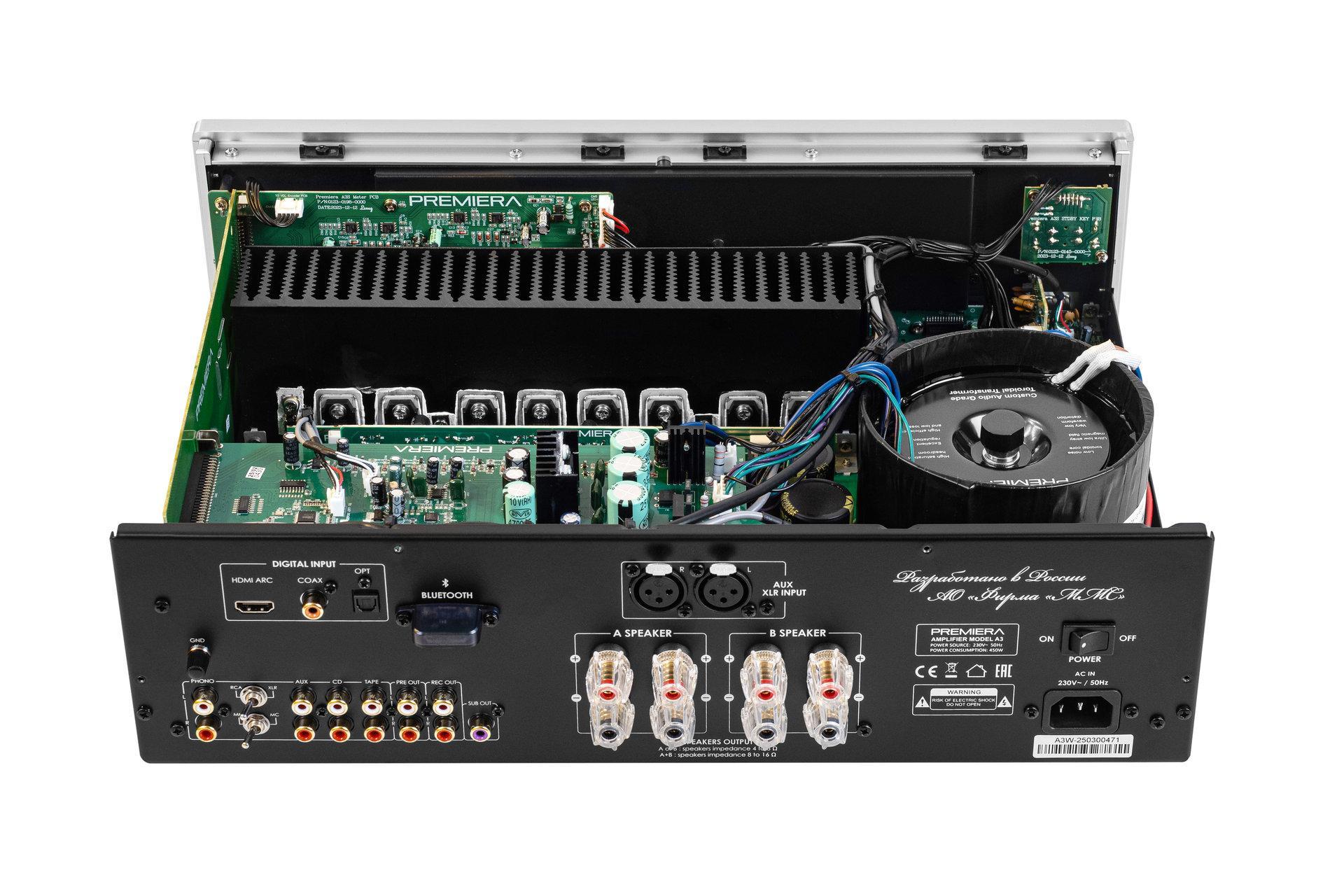 За главную функцию усилителя Premiera A3 отвечает его усилительная часть, построенная на тороидальном трансформаторе мощностью 450 Вт, расположенном в отдельном экранированном блоке.