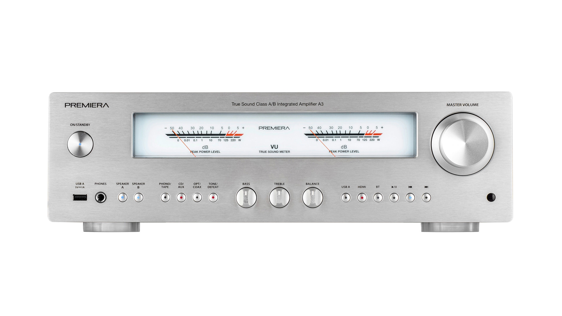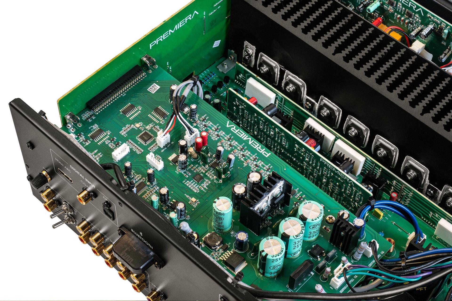 Premiera A3 - современный интегральный Hi-Fi стереоусилитель класса AB со встроенными MM/MC фонокорректором, ЦАП, Bluetooth, HDMI ARC, с номинальной выходной мощностью 110 Вт на канал.