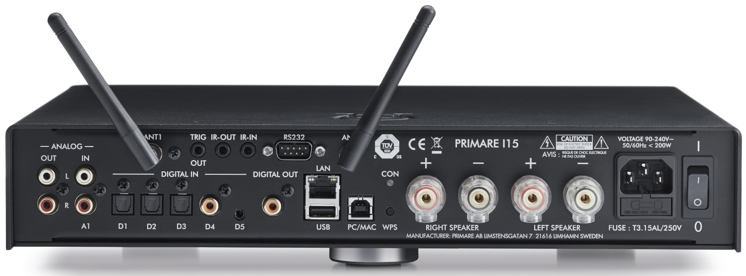 Primare I15 Prisma состоит из двух дискретных усилителей на сверхбыстрых блоках питания. Корпус Primare I15 Prisma выполнен из толстой стали, которая обеспечивает прочность и надежность, прекрасно экранирует устройство и эффективно поглощает вибрации внешних источников. Для уменьшения уровня искажений секция предусиления расположена в отдалении от секции усилителя мощности и питается от отдельного блока питания. Primare I15 Prisma оснащен одной парой несимметричных входных RCA разъемом, тремя оптическими входами, коаксиальным входом, USB тип A и B, линейным выходом . Кроме этого, возможности управления системой расширяются благодаря разъему RS232, инфракрасному входу/выходу и релейному выходу. Также в усилителе предусмотрены сетевые подключения при помощи Wi-Fi и Bluetooth технологий, также шведы не забыли и о технологии Airplay.