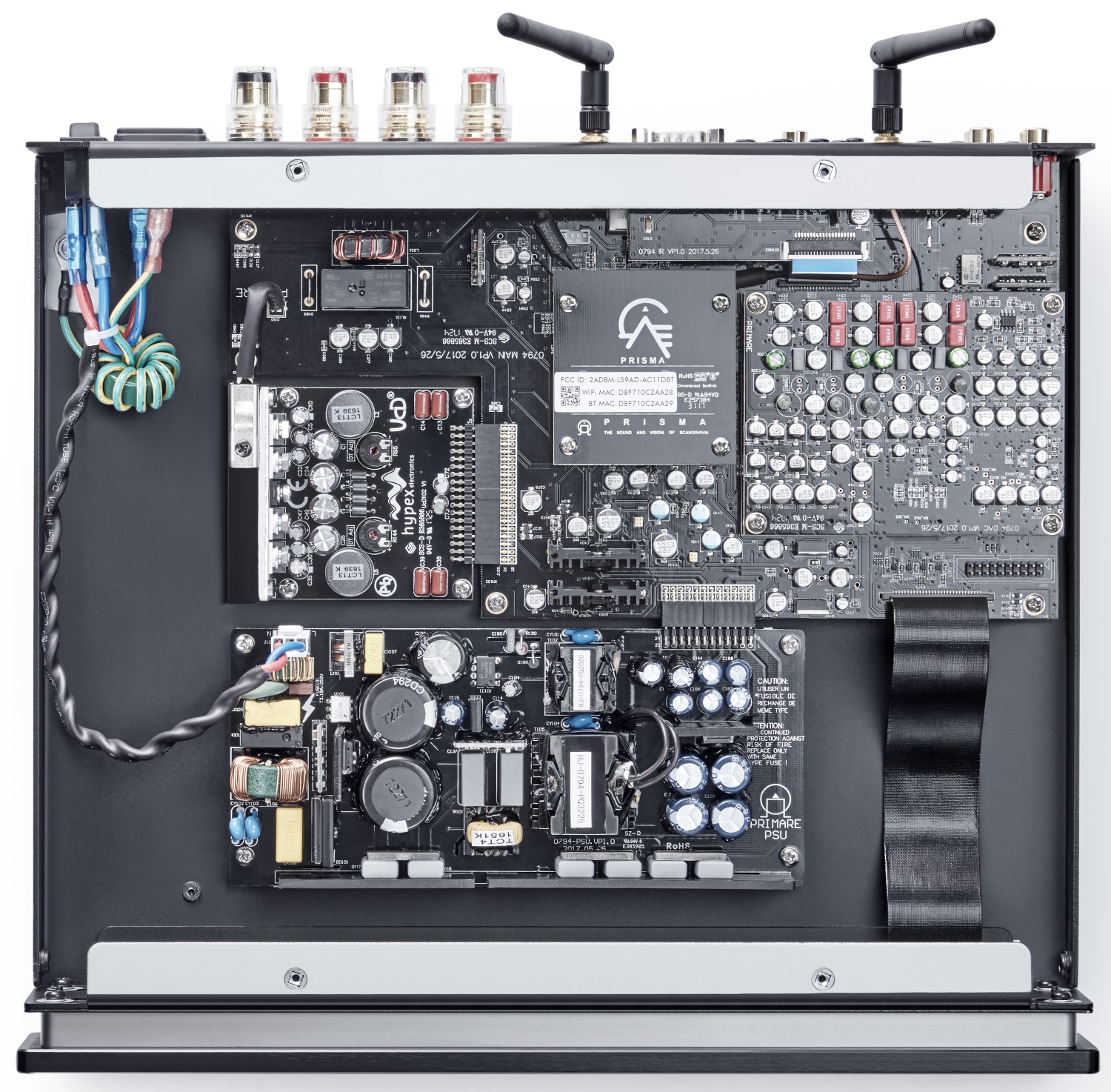 Модули Prisma имеют две антенны для беспроводной связи, порты Ethernet и USB-порт А-типа. Будут поддерживаться музыкальные форматы WAV, LPCM, AIFF, FLAC, ALAC, MP3, MP4 (AAC), WMA, OGG, записи высокого разрешения до 24 бит/192 кГц и DSD. Кстати, воспроизведение формата DSD ‒ совершенно новая функция в компонентах Primare, никогда не встречавшаяся в предыдущих моделях.